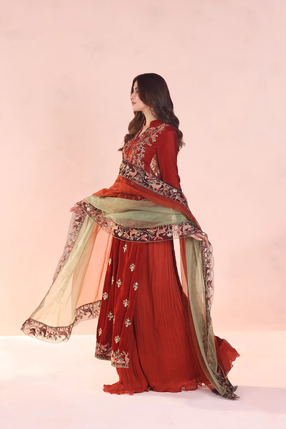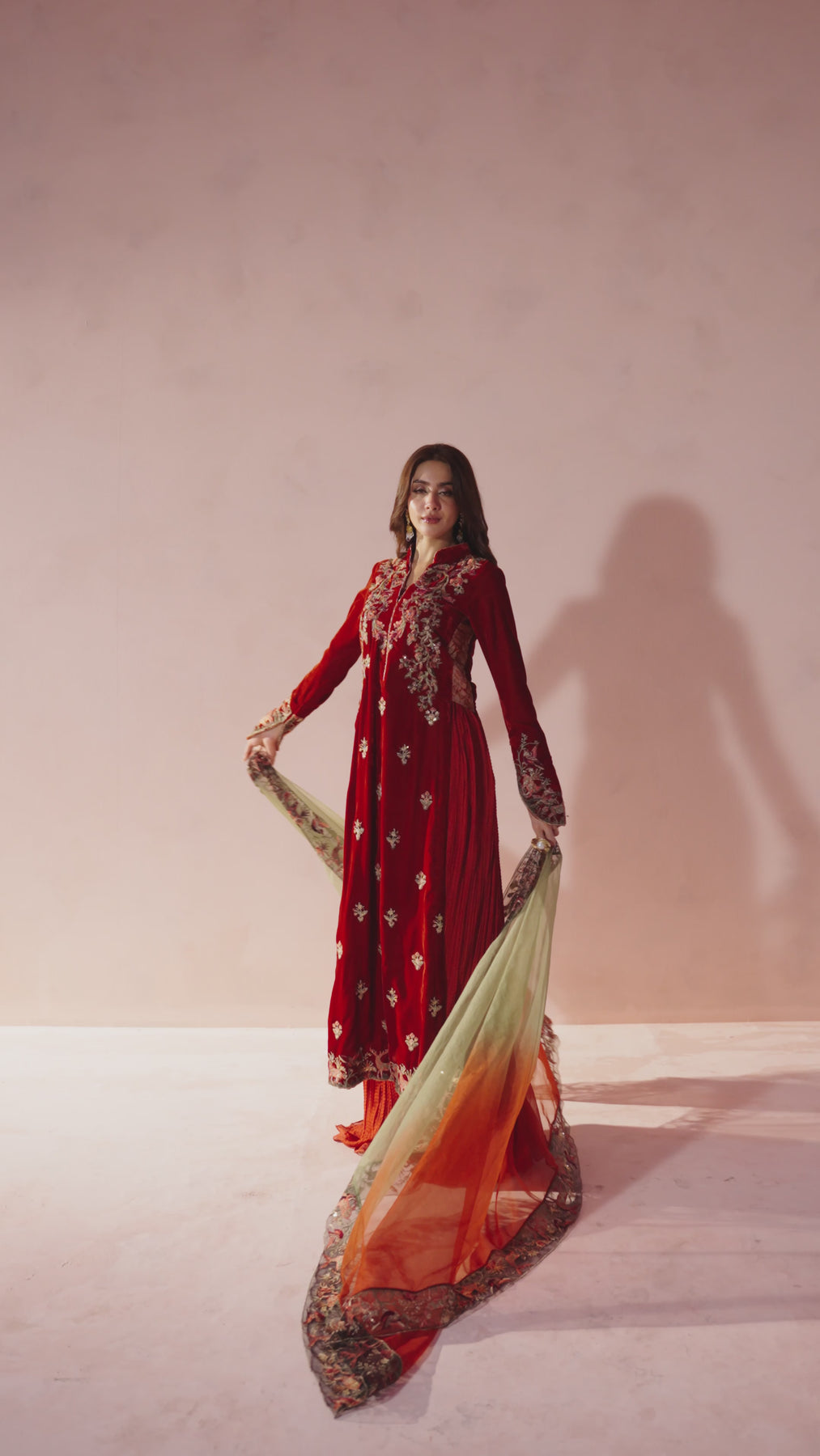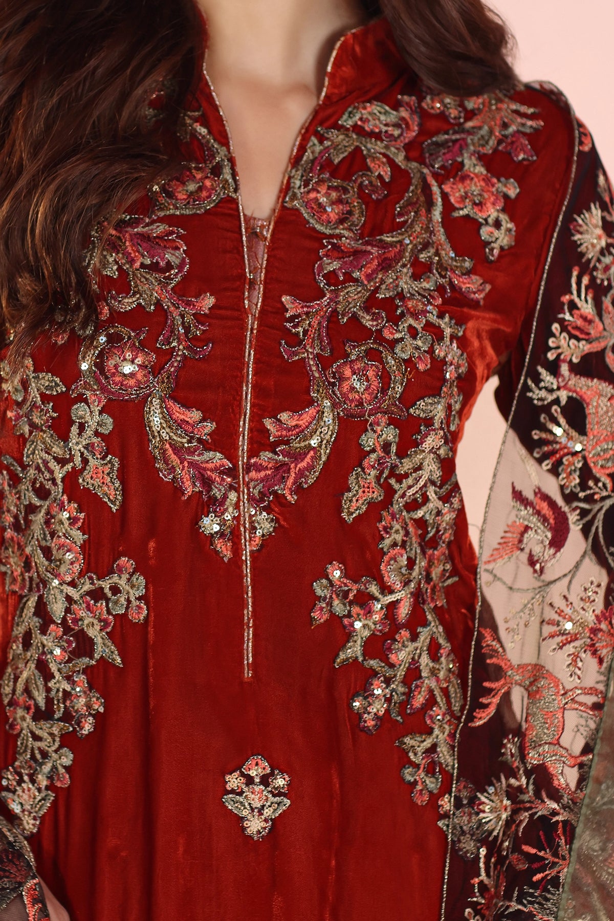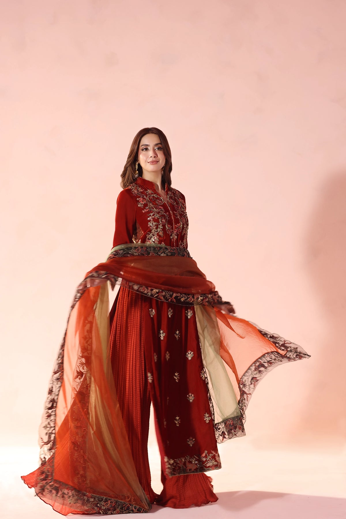 A timeless statement in velvet, Ember Glow captivates with its rich hue and all-over embroidery. The long silhouette is adorned with an intricately worked neckline, sleeves, and scattered sprays, brought to life with resham, tilla, and sequins in layered tones. Kimkhaab side panels lend depth and structure, elevating the sleek form. Paired with a shaded organza dupatta framed in a four-sided embroidered border of resham and tilla, this ensemble embodies regal sophistication with couture artistry.