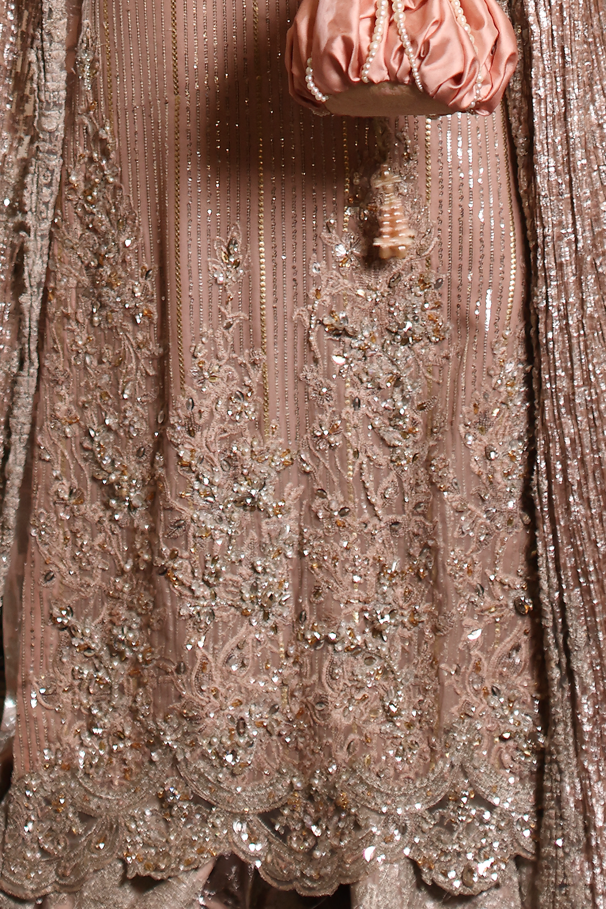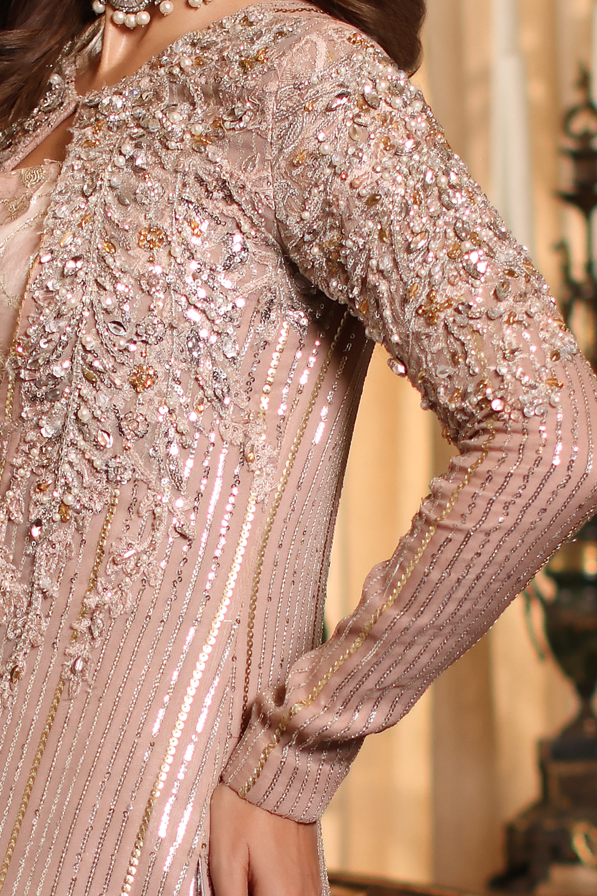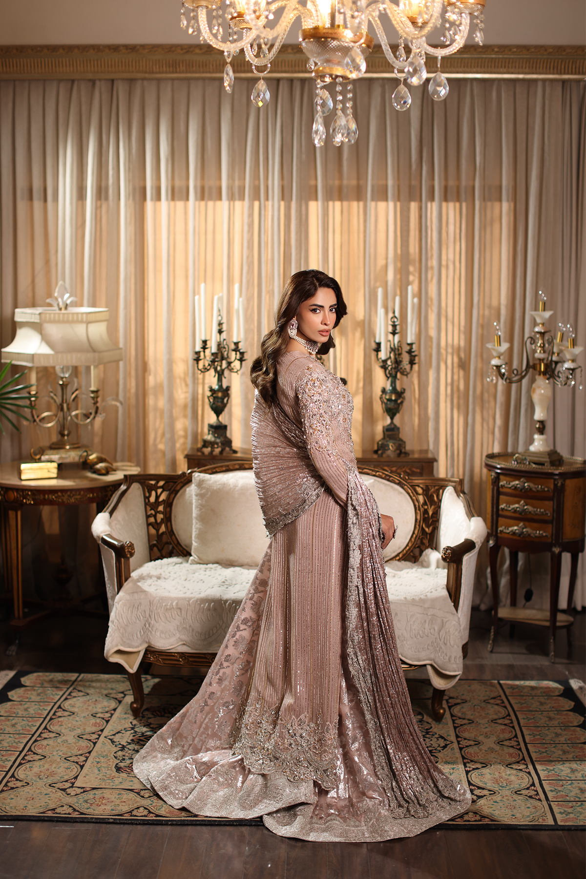 Soft, romantic, and endlessly graceful — Rosé Whispers captures the gentle spirit of femininity in motion. Crafted in delicate pink hues, it features refined embroidery and luminous hand embellishments that evoke the timeless elegance of a rose in bloom. Every detail reflects Musferah Saad’s devotion to hand artistry — whispering of beauty, poise, and couture serenity.