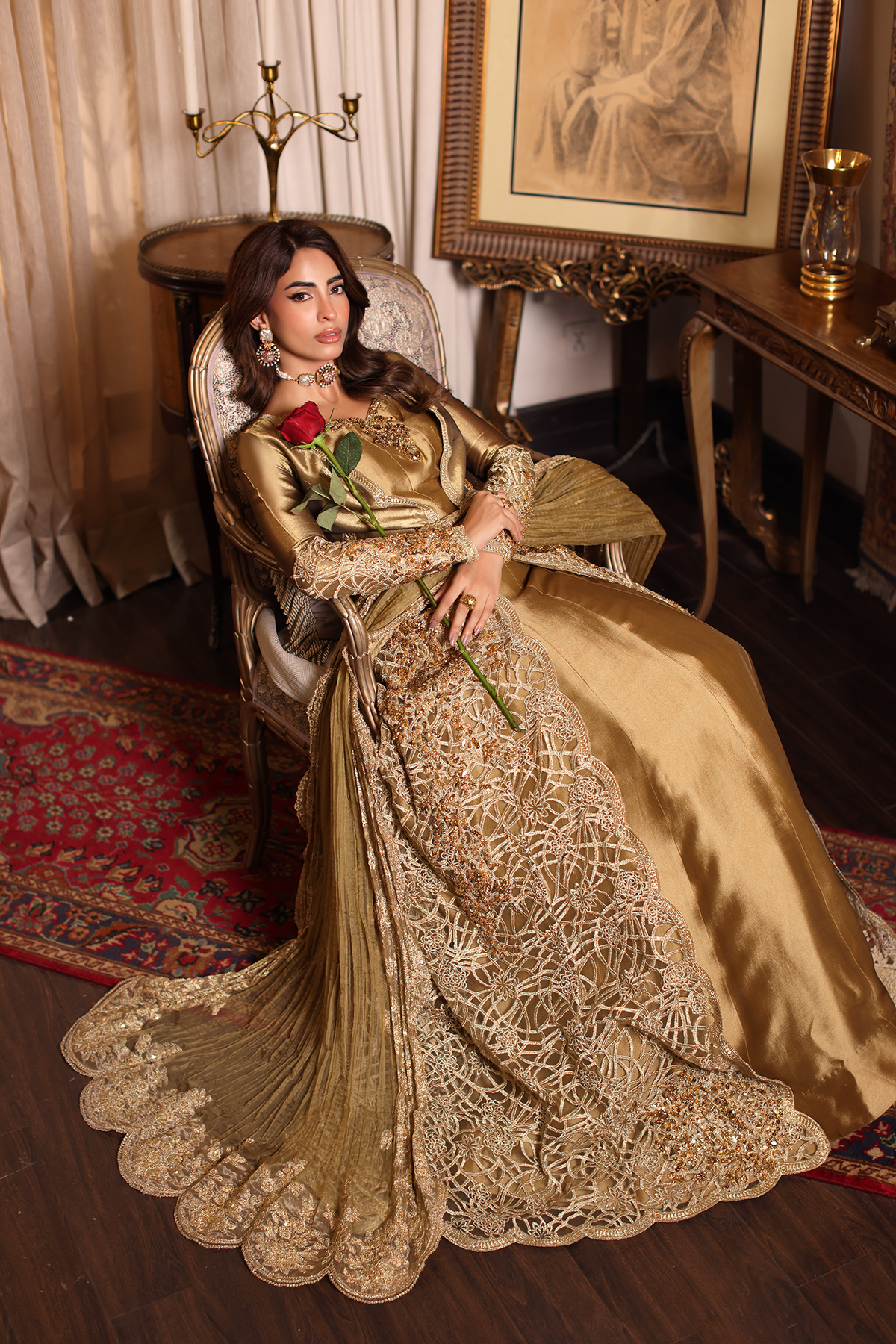 Sunlit Grace evokes the golden warmth of daylight woven into couture. The silhouette reflects refined tailoring with delicate embellishment, blending tradition with effortless sophistication. Intricate gold tilla and resham embroidery illuminate the design, creating a glowing harmony of texture and elegance. Each element, from stitch to shimmer, is shaped through painstaking handwork — a radiant expression of modern regality.