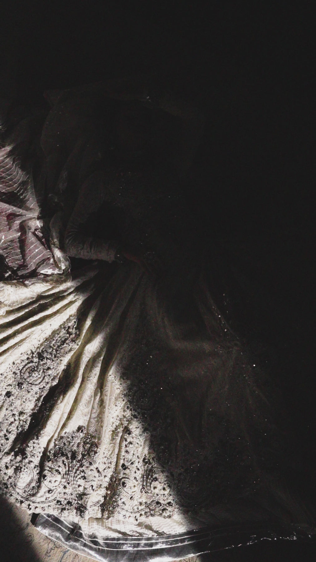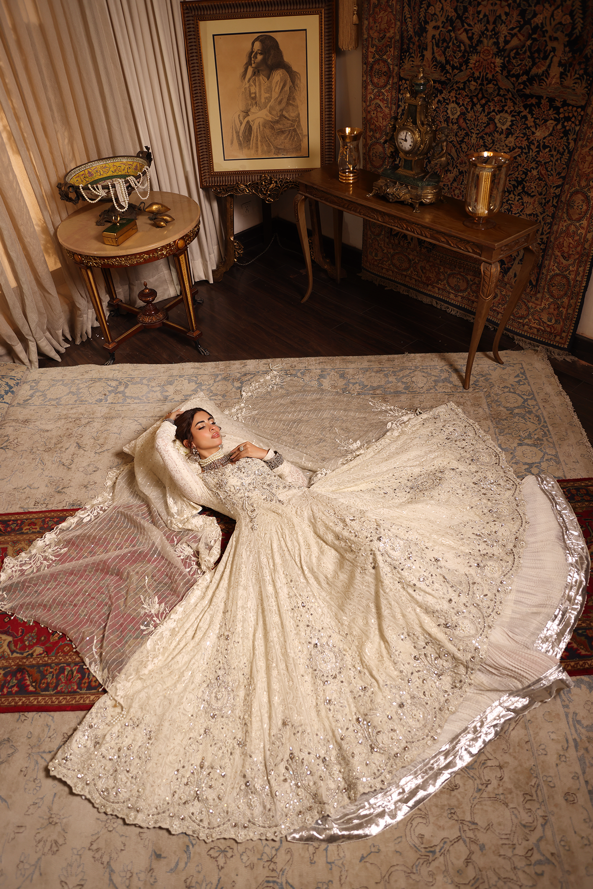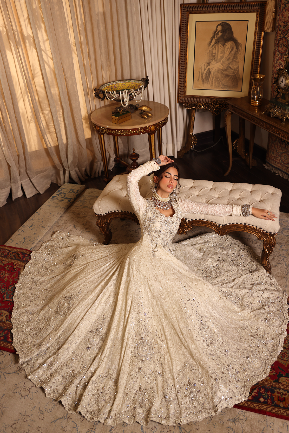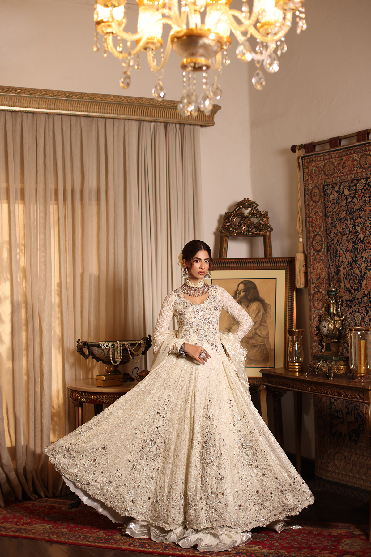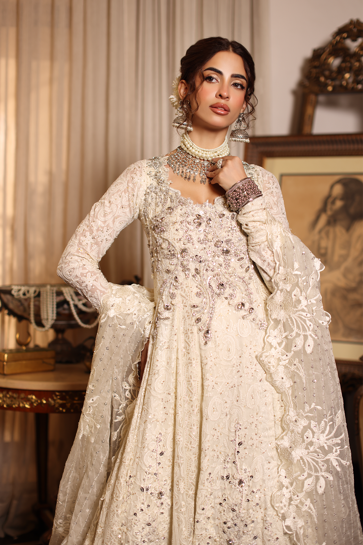 Pearl Divinity embodies purity and grace, capturing the essence of ethereal couture. The pristine white peshwas flows like poetry,hand detailed with resham and tilla embroidery that glimmers softly in the light. Gorgeous hand embellishments of pearls and crystals enhance its divine serenity. A creation designed for the modern goddess — graceful, luminous, and timeless.