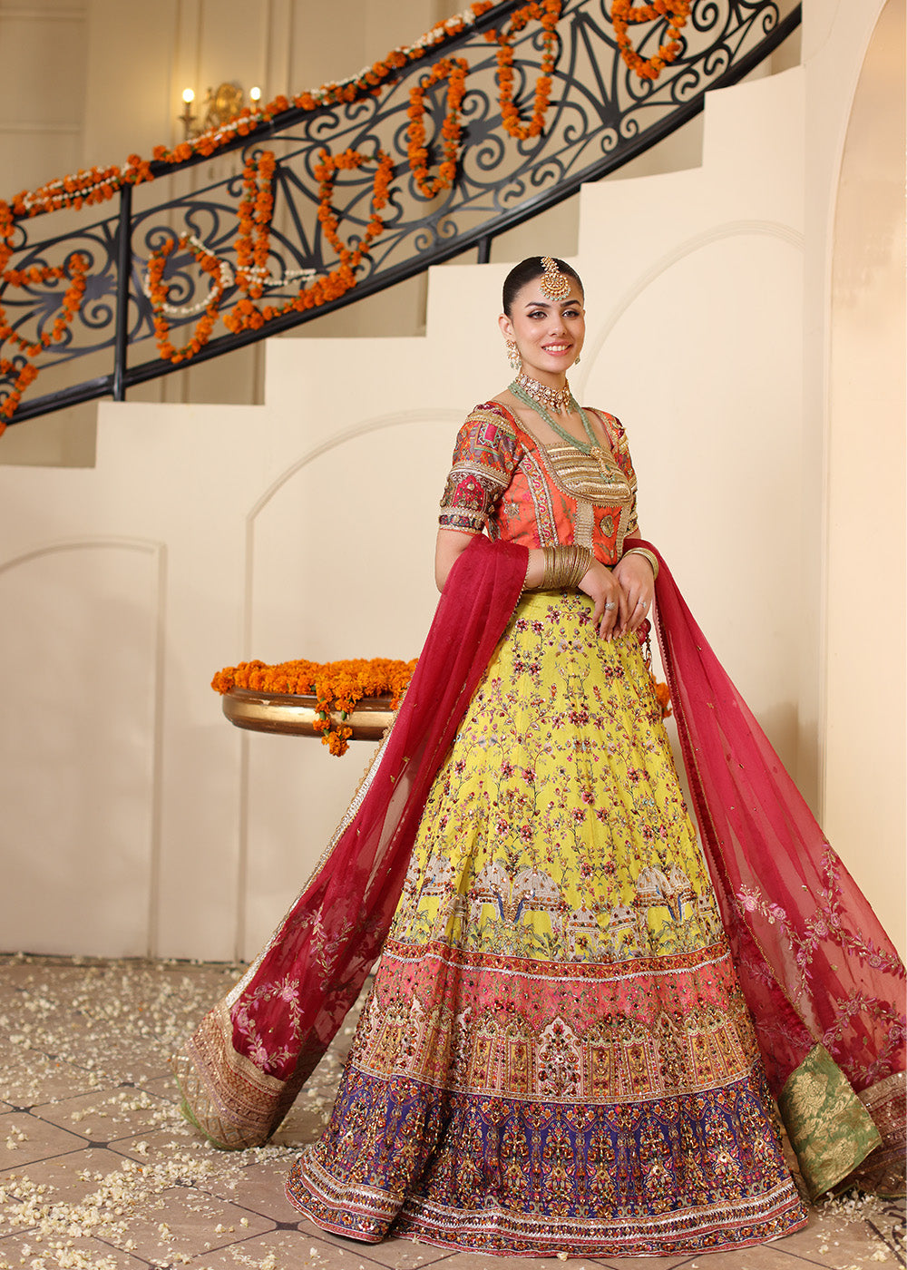 A vibrant printed raw silk lehenga featuring Mughal architecture and florals with wide, bold borders for enhanced color blocking. Embellished with lappa, gota, 3D floral work, etched pipes, and sequins, it’s finished with traditional tassels. The double-layered blouse neckline features Indian lace detailing. Comes with a net dupatta detailed with heavy tilla/resham borders and crystal spray throughout.