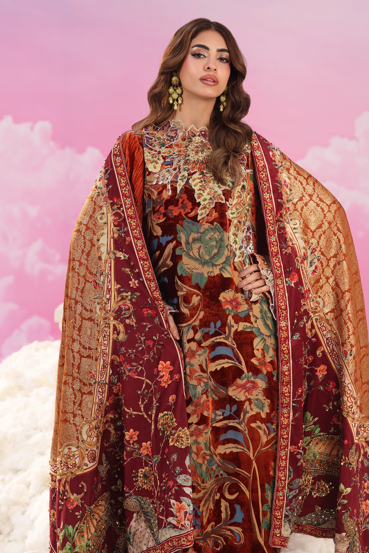 Where regality meets radiance — Eternal Flame is a majestic printed velvet shawl, intricately fused with kimkhaab to heighten its royal allure. The shawl unveils a breathtaking scenic composition inspired by Mughal grandeur — featuring architectural arches, blooming florals, graceful birds, and majestic peacocks that serve as its focal point. Baroque design accents bring symmetry and depth to the design, while hand embellishments of colorful beads, sequins, and stones shimmer across the surface.