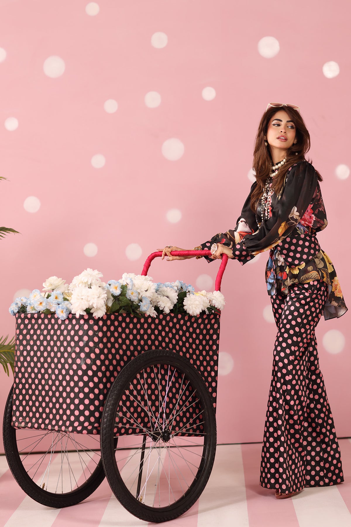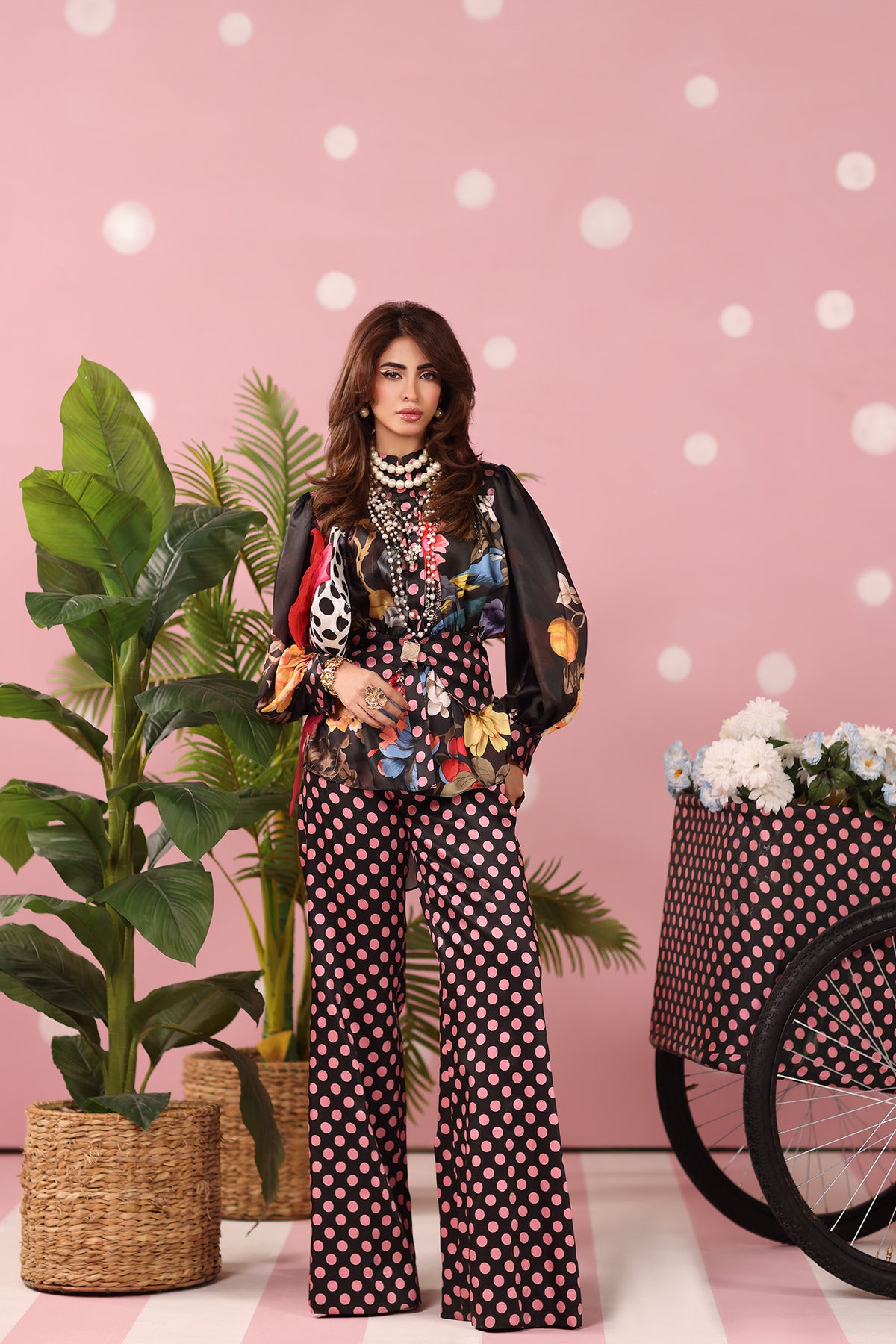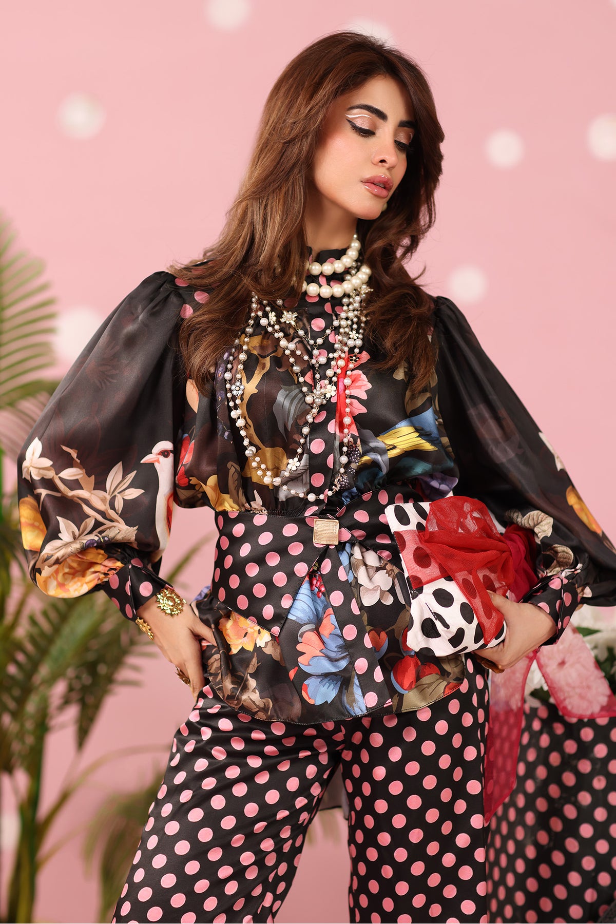 "With this high-contrast ensemble, Polka Panache, I wanted the vintage dot pattern to serve as a sophisticated visual anchor, while the floral placements reveal a curated, editorial depth. The gathered yoke and tailored belt are my way of adding a sharp, modern bite to a playful, chic-inspired narrative." — Musferah Saad