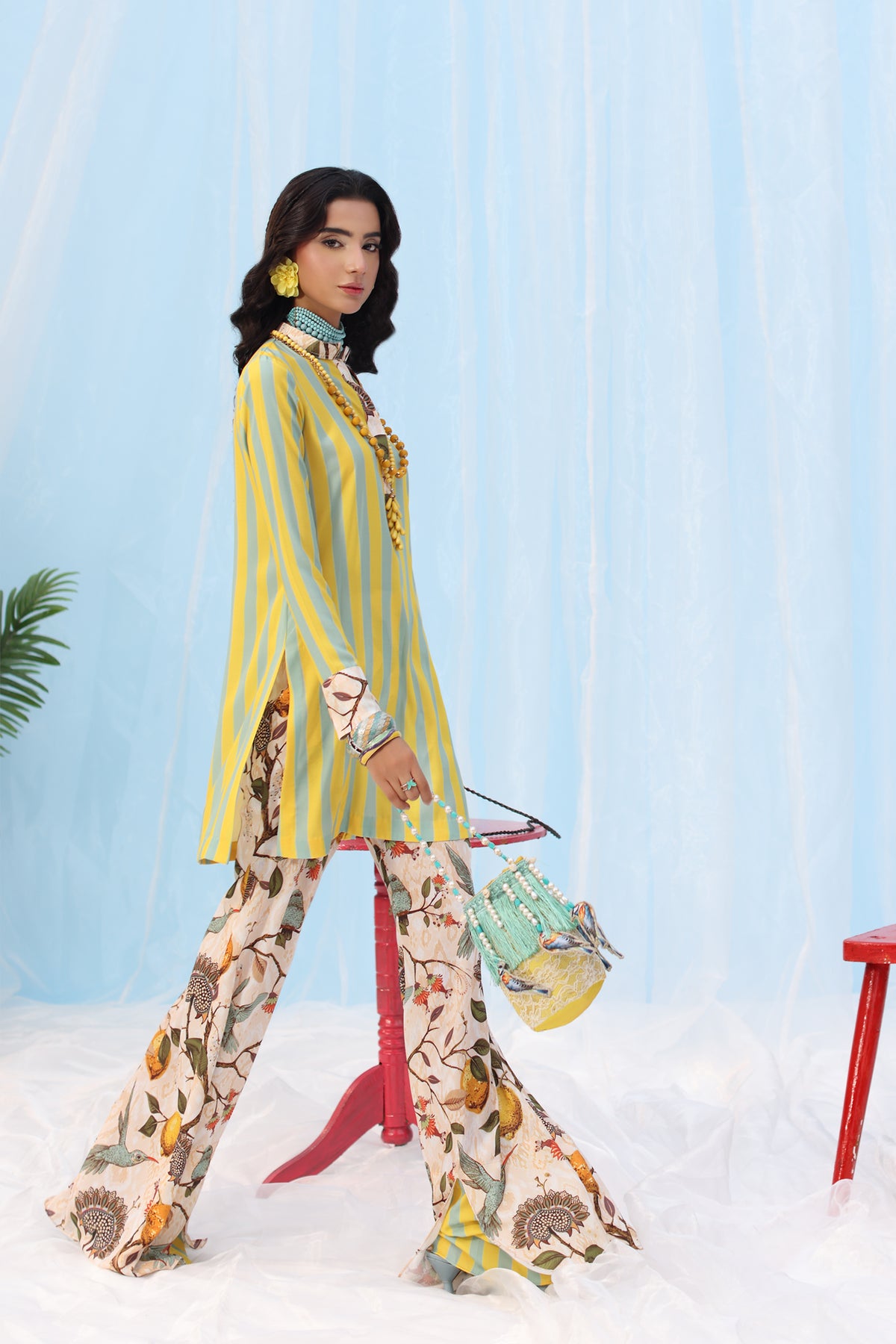 Chic meets understated in this effortlessly modern ensemble. A clean, straight-cut shirt features bold contrasting stripes and seamless color blocking, setting the tone for laid-back sophistication. Paired with printed bootcut pants detailed with natural motifs—birds, florals, and citrus elements—the look strikes a perfect balance between minimalism and personality. An ideal choice for elevated daywear with a fresh twist.