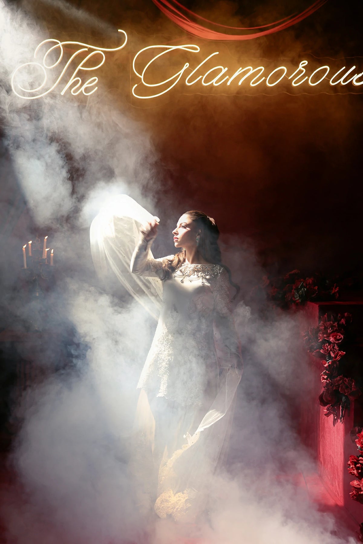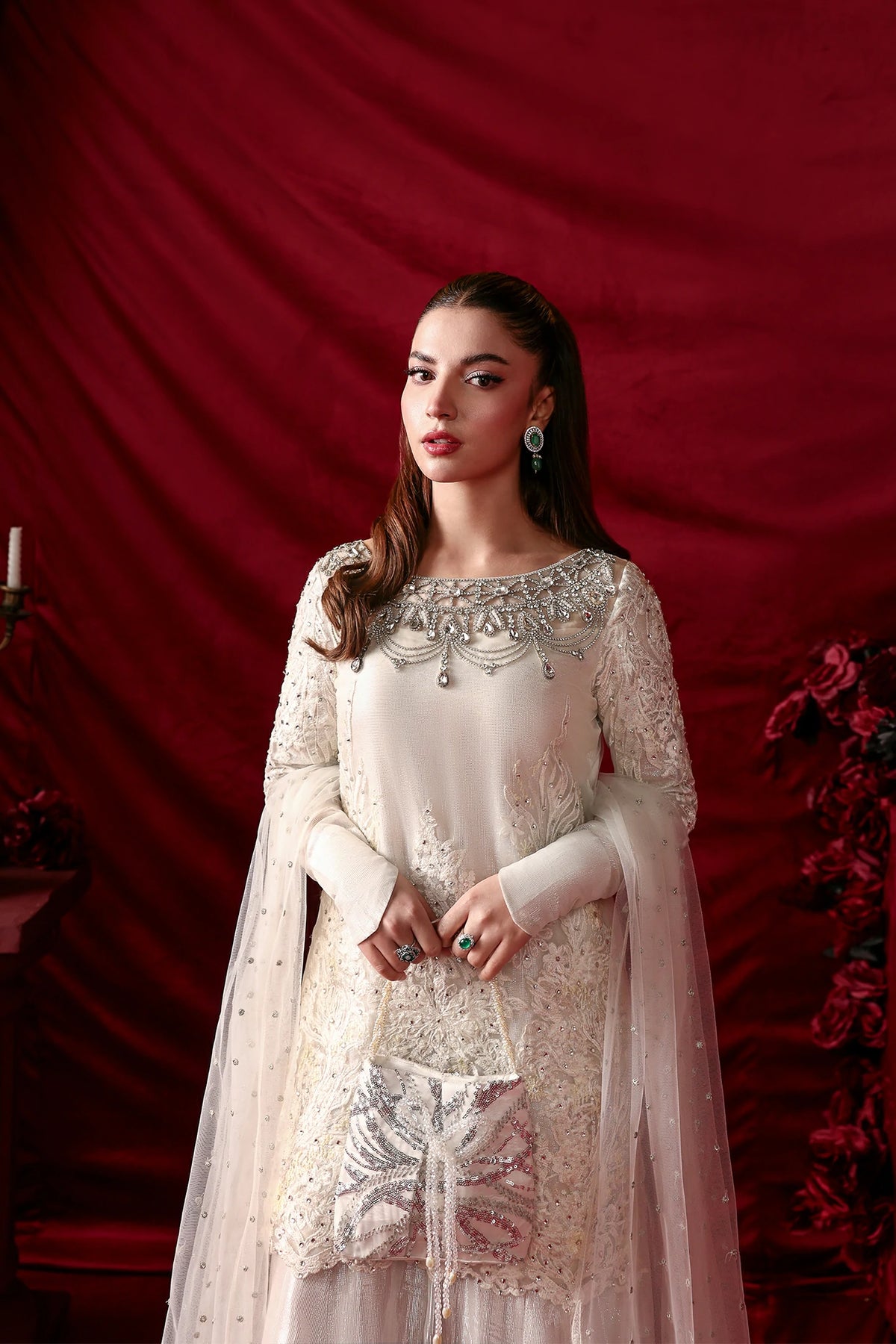 • The Swarovski-Encrusted Neckline: A boat Neckline completely hand-embellished with Swarovski crystals and premium stones to create a radiant, jewel-like frame for the face.