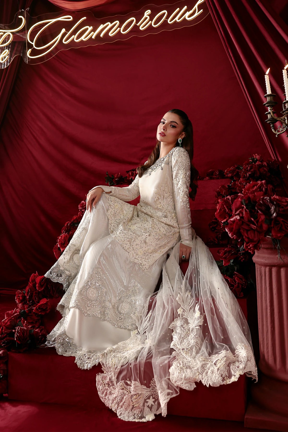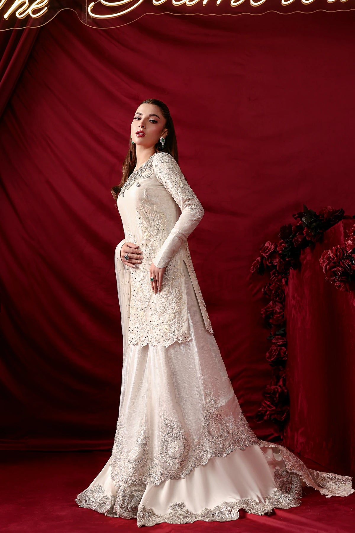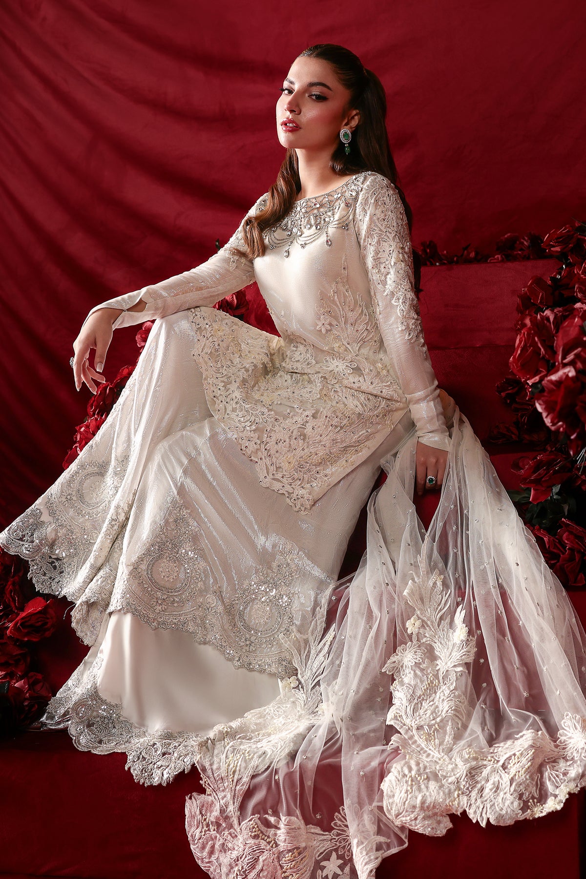 "With Asteria, I wanted to play with the idea of 'celestial layers.' The Royal White net and tensil chiffon lining create a soft, imperial glow, while the Bejeweled Neckline dripping in Swarovski and the double layered sharara add that sharp, architectural edge. It is a dress for the woman who wants her elegance to be both seen and felt." — Musferah Saad