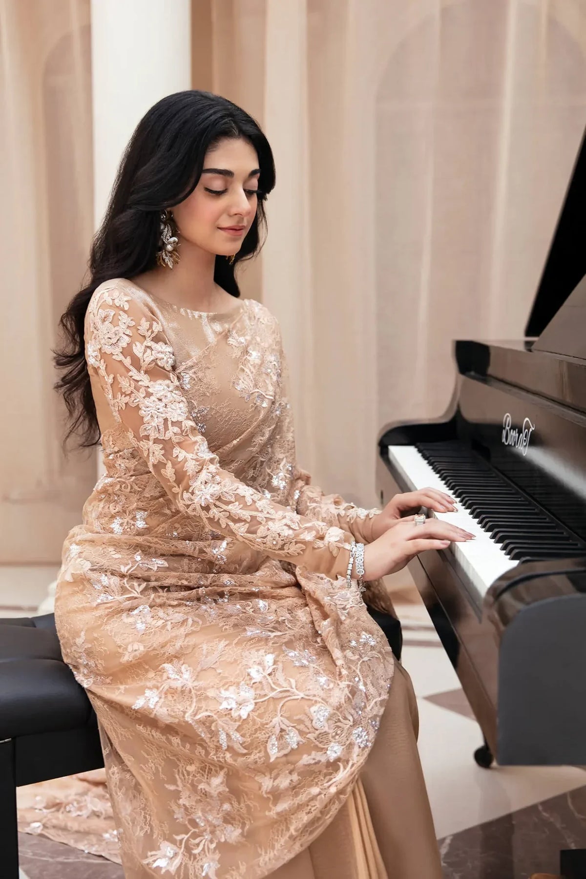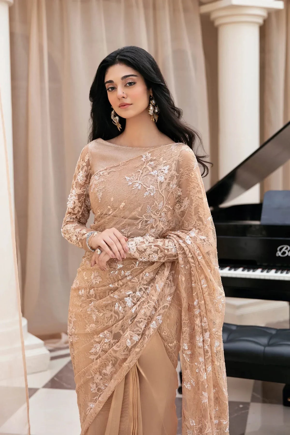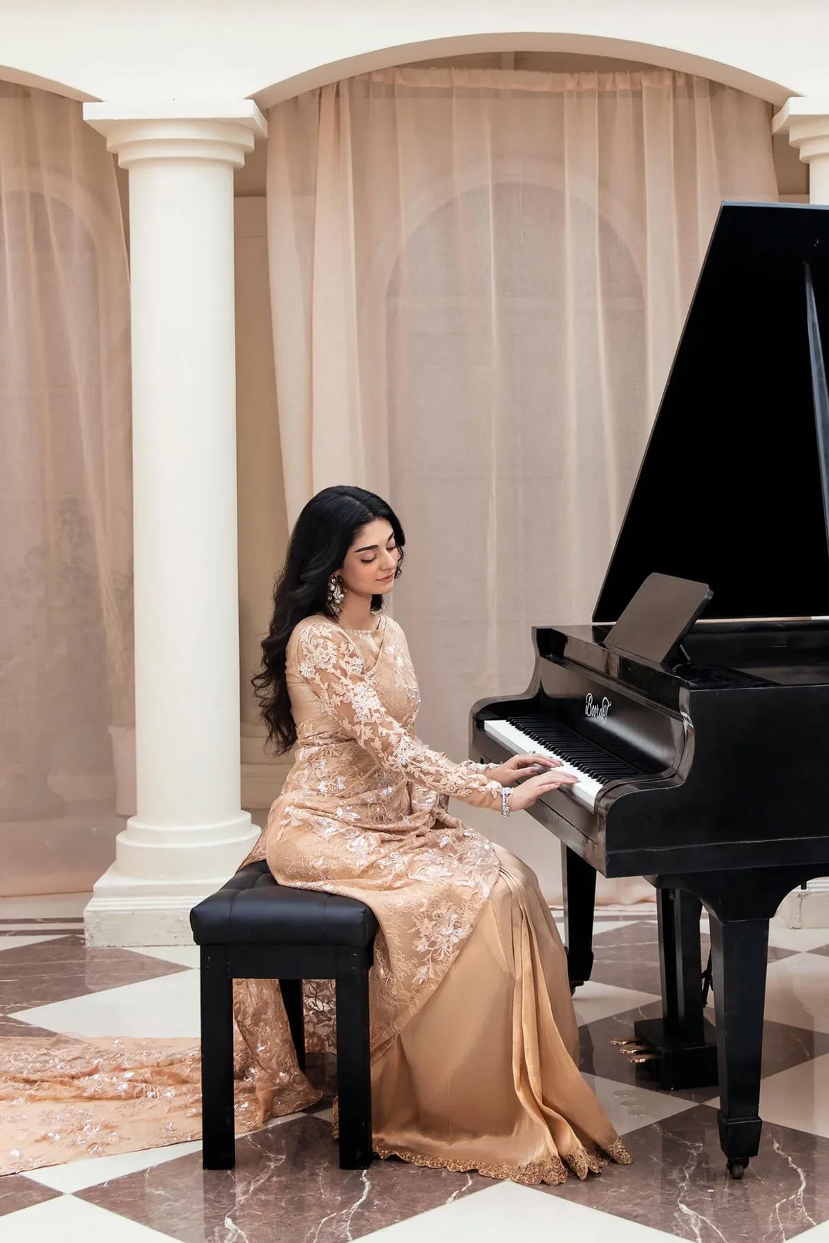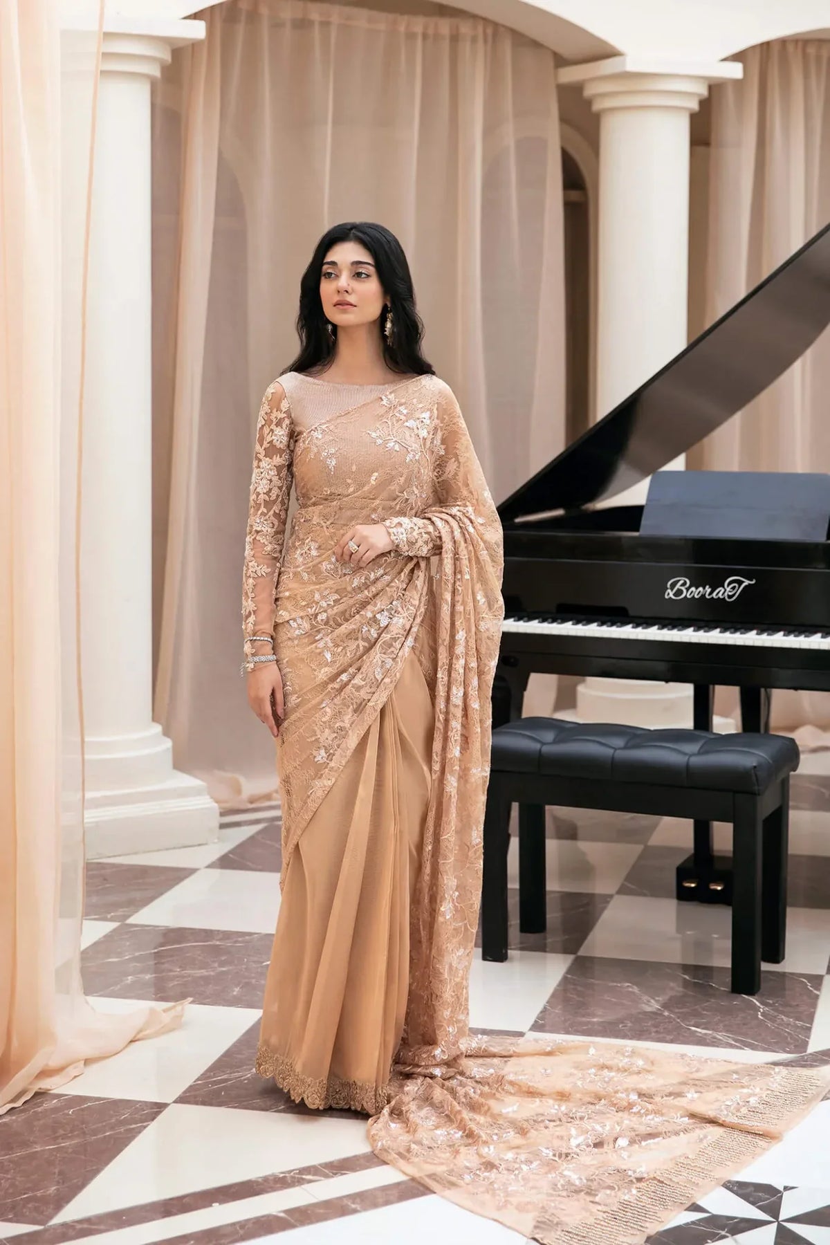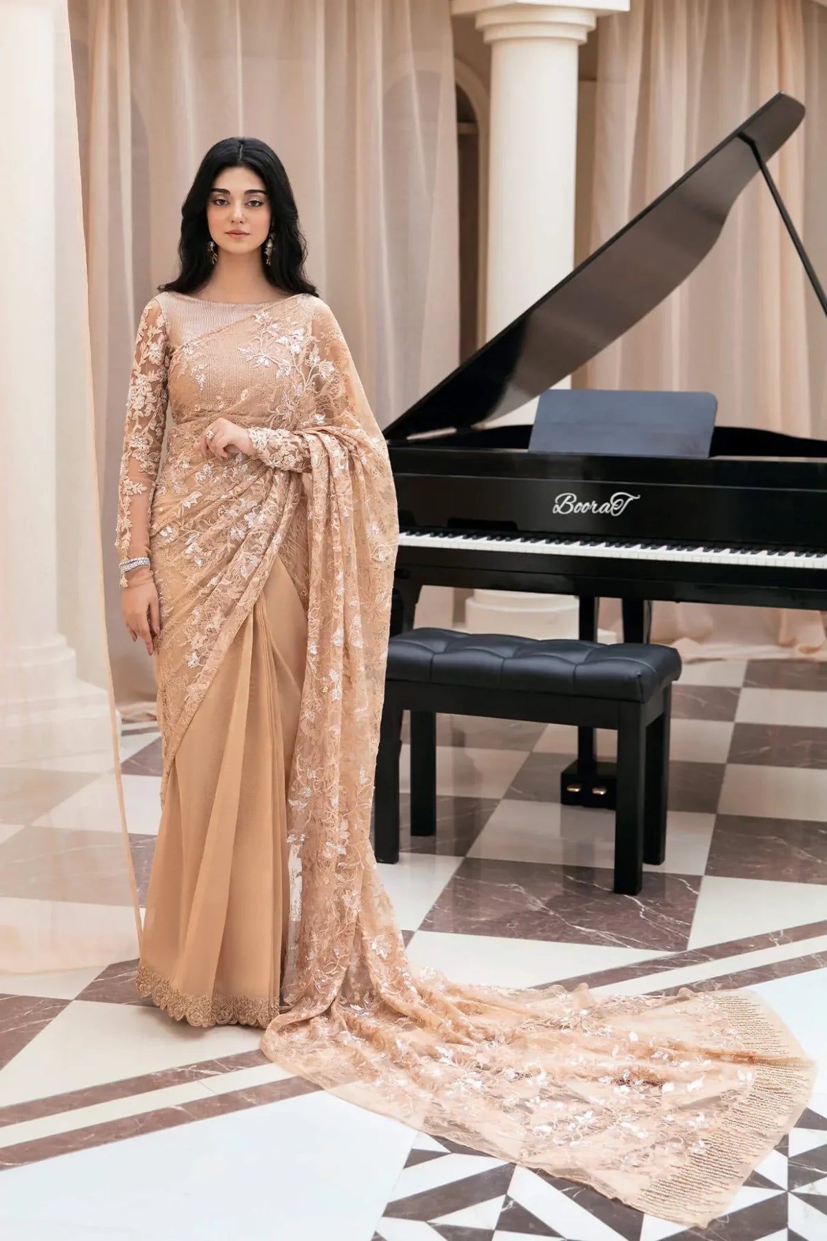 Embrace your inner dame with the exquisitely designed saree, ‘Sublime Rose’. This breathtaking piece, set on a delicate lace canvas, is intricately adorned with pearls and sequins that shimmer with every move. Gorgeously crafted to accentuate the feminine silhouette, ‘Sublime Rose’ is not just an ensemble—it’s a statement. A symphonic MS melody that is sure to wow!