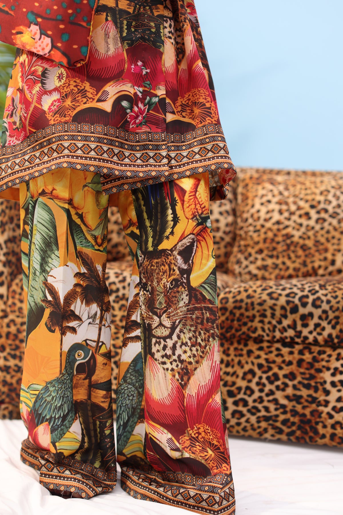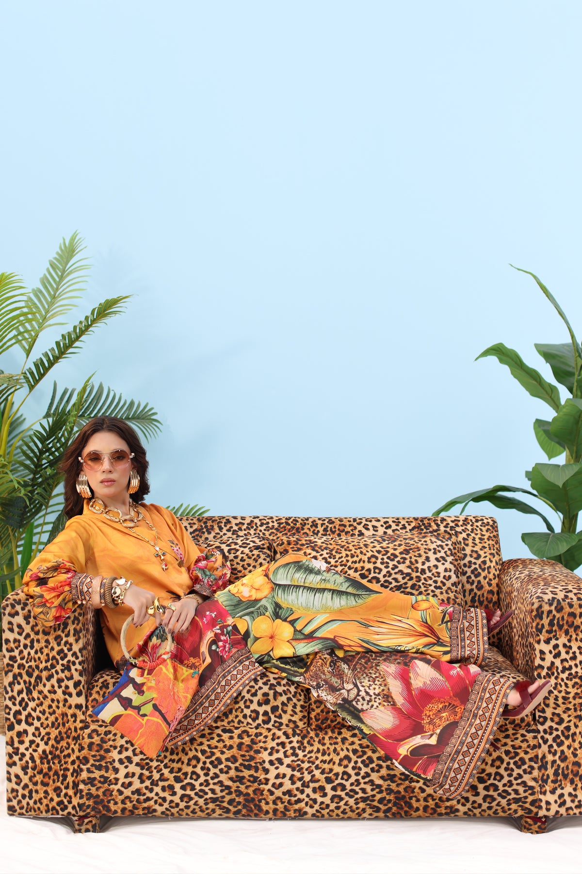 “Rich and radiant, this creation embodies chic sophistication with its sculpted layers and fluid lines. The vivid golden canvas bursts to life with tropical artistry, while tailored accents and flared proportions reflect couture-level precision and thoughtful design storytelling.”