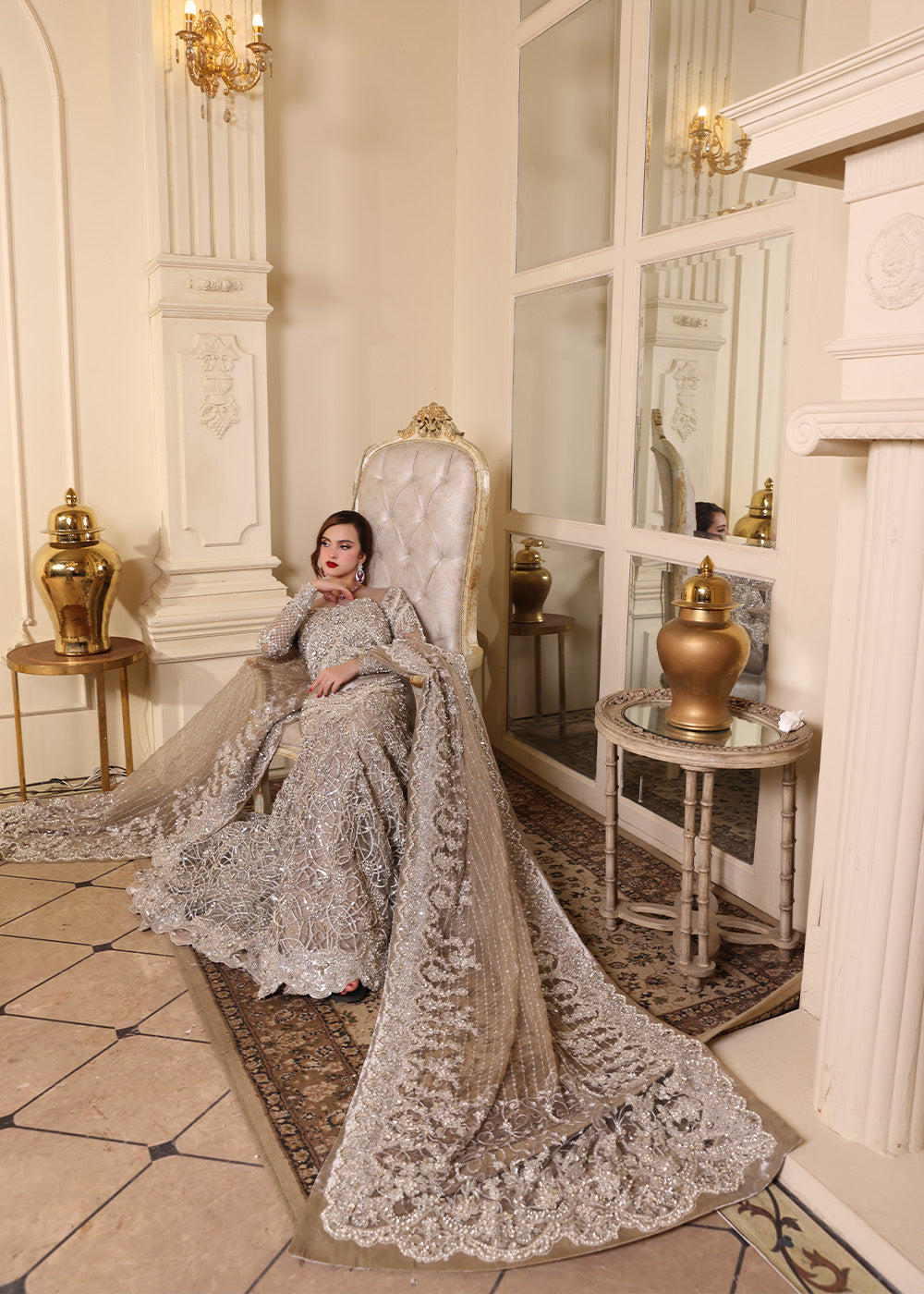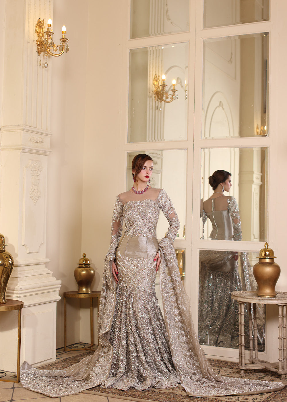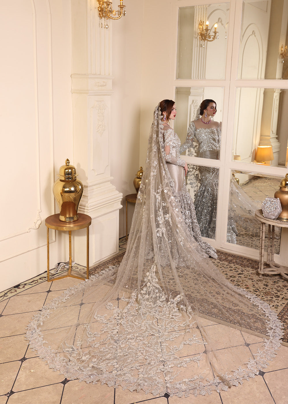 An embodiment of bold elegance, The Silver Mermaid captures the allure of glamour with its curve-enhancing mermaid silhouette and opulent metallic shimmer. The fitted pleated bodice seamlessly flows into an extravagantly flared base, adorned with a gorgeous embroidery and encrusted in exquisite hand embellishments. Crafted from luxurious tissue, the gown is drenched in resham and silver tilla, then painstakingly hand-adorned with pearls, rhinestones, multi-shaped sequins, etched pipes, and crystals—each detail placed with precision by master artisans. A four-sided scalloped tissue dupatta frames the look with richly embellished borders and widths, while the ethereal veil is showered in crystal spray and delicate embroidery. This showstopping look required extensive research and hours upon hours of couture handwork, culminating in an unforgettable silhouette made for the modern queen.