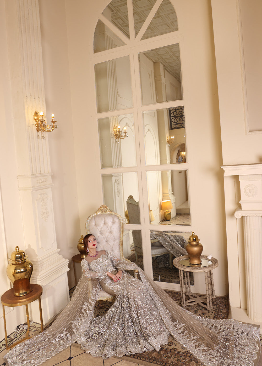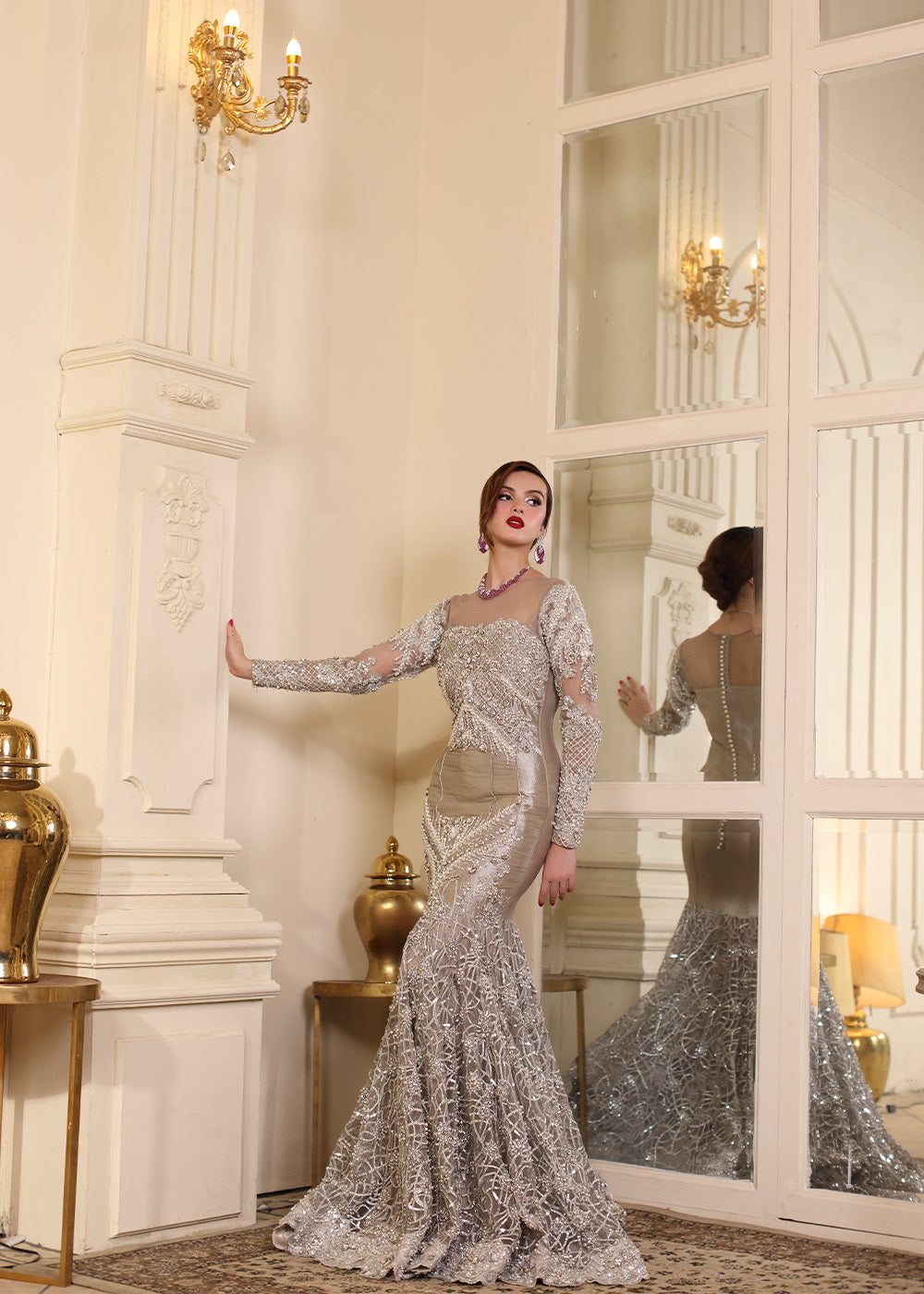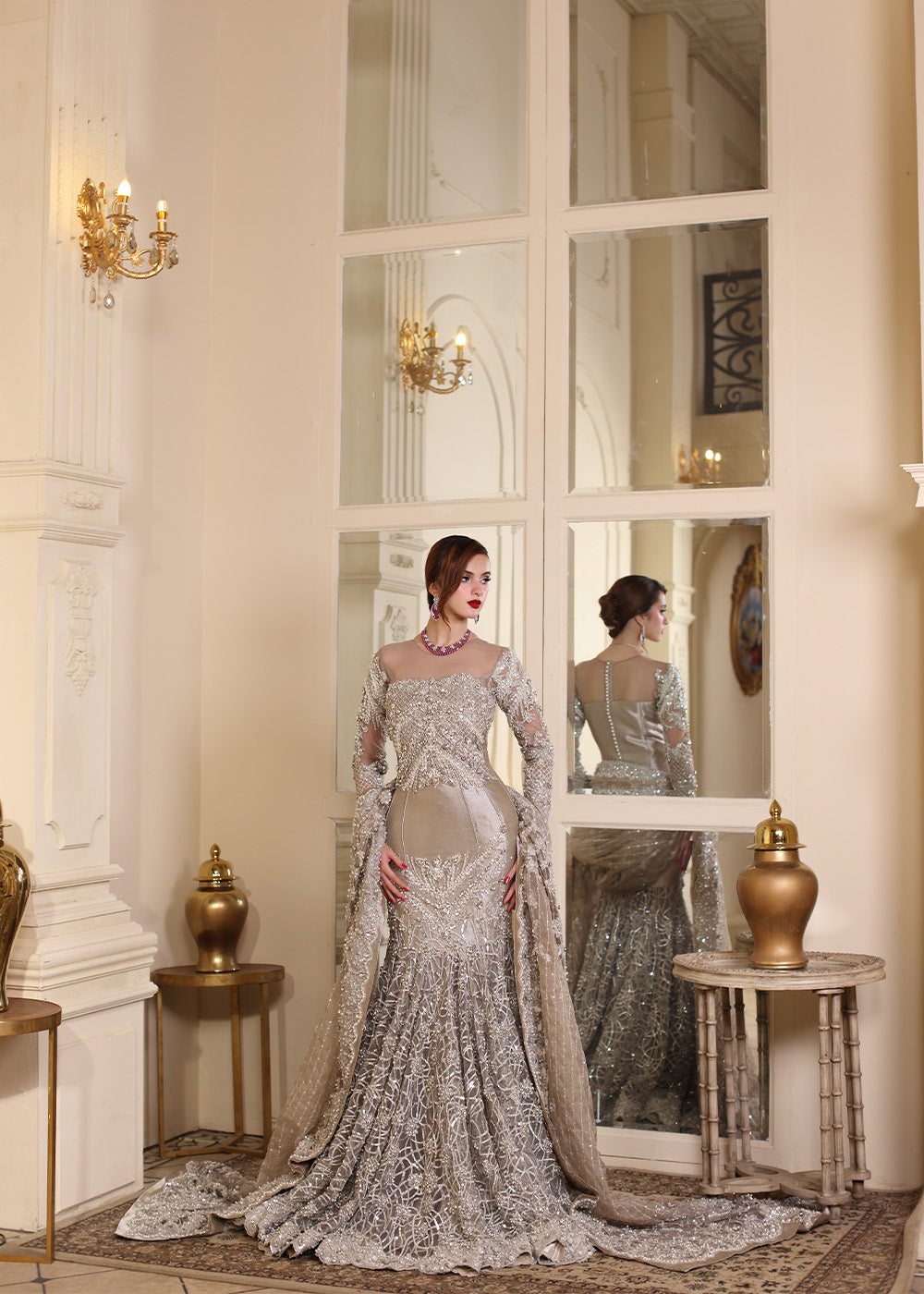 An embodiment of bold elegance, The Silver Mermaid captures the allure of glamour with its curve-enhancing mermaid silhouette and opulent metallic shimmer. The fitted pleated bodice seamlessly flows into an extravagantly flared base, adorned with a gorgeous embroidery and encrusted in exquisite hand embellishments. Crafted from luxurious tissue, the gown is drenched in resham and silver tilla, then painstakingly hand-adorned with pearls, rhinestones, multi-shaped sequins, etched pipes, and crystals—each detail placed with precision by master artisans. A four-sided scalloped tissue dupatta frames the look with richly embellished borders and widths, while the ethereal veil is showered in crystal spray and delicate embroidery. This showstopping look required extensive research and hours upon hours of couture handwork, culminating in an unforgettable silhouette made for the modern queen.